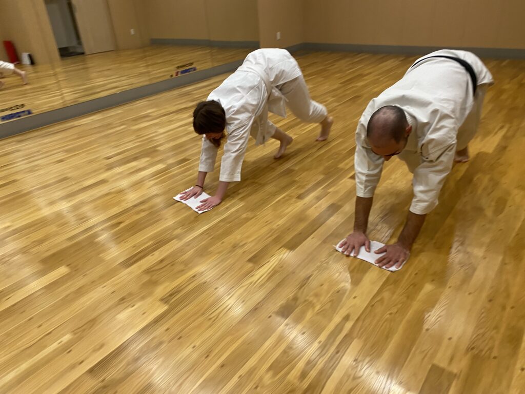 We begin with seiza (formal sitting) and mokuso (silent meditation) to calm the mind and focus.